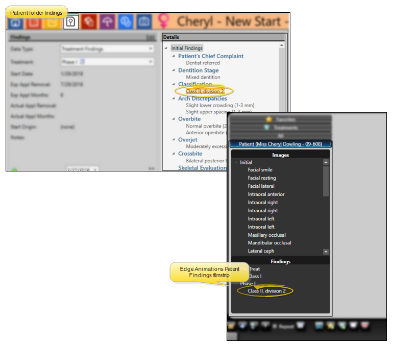 Then, when you launch Edge Animations for a patient with "Class II, division 2 crowding", and click the Patient tab, your filmstrip will appear in the Findings section for you to present to them.