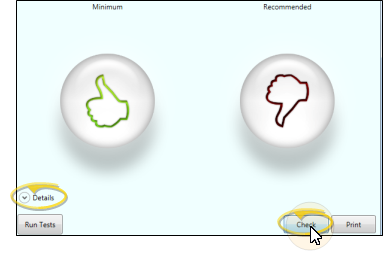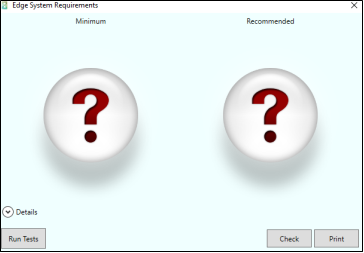 Click the Check button to compare this computer's components against the Edge System Requirements specifications. After the check has been performed, the application displays a simple thumbs up or thumbs down for our minimum and recommended specifications. To show the details that make up each rating, click the Details option. A computer that passes the minimum rating will lead to program performance that is only minimally acceptable. These minimums are meant for non-critical or lower use stations and will not be suitable for all program uses. For a better experience follow the recommended specifications. Passing the recommended rating means the computer should provide an optimal Edge Cloud experience.