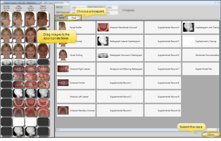 Click the timepoint tab you want to work with. Then drag the appropriate image from the left side of the window into each image box. Repeat the process for each timepoint. If you make an error, you can simply drag the correct image onto a filled box to replace it, or right-click to clear the image box completely.