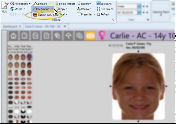 Open the patient's Imaging page. Then, from the Imaging section of the ribbon bar, open the Integrations dropdown and select ABO Case Submit. Morph.