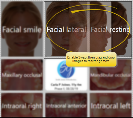 You can use the Swap tool to add external images to a patient folder, or to rearrange images in a layout. Swap is available from both image Editing mode and Single Import mode. You can enable Swap from the Editing section of the Imaging ribbon bar, or by holding down the ALT key on your keyboard.