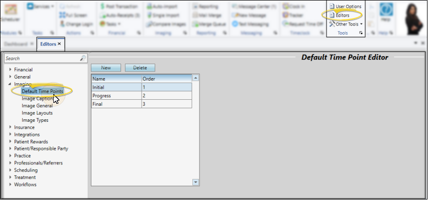 Select Editors from the Tools section of the Home ribbon bar. Then, from the Imaging section, open the Default Time Points editor. (You can also use the Search field to look for the editor you want to work with.)