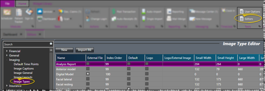 Select Editors from the Tools section of the Home ribbon bar. Then, from the Imaging section, open the Image Types editor. (You can also use the Search field to look for the editor you want to work with.)