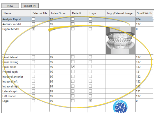 Logo - Usually, you enable this Logo option for the Logo and Small Logo image types, which provide a way for you to include your practice logo in your imaging layouts. Once you enable this option, use the [...] button in the Logo / External Image column to import the file you want to use. When you use this image type in a layout, the image you imported will be displayed. When you include your logo in a static layout, you will also see the information you have selected for your Layout Caption in your Image Caption editor. We suggest you enable this option and upload your logo into both the Logo and Logo (Small) image types.