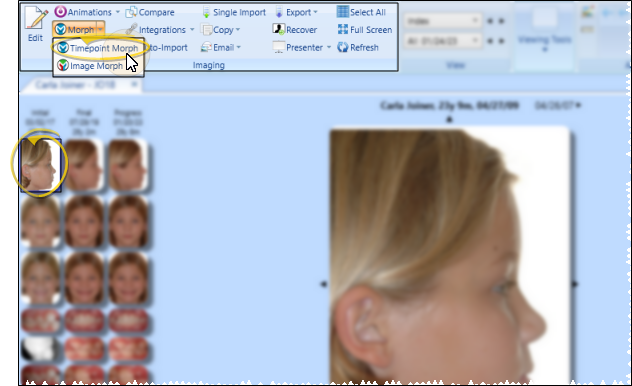 Open the patient's Imaging page, and select the image you want to work with. Then, from the Imaging section of the ribbon bar, open the Morph dropdown and select Timepoint Morph.