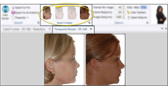 Click the images in the Select Images section of the Timepoint Morph ribbon bar to choose which timepoints you want to include in the morph. All the timepoints available for the image type you selected are available to choose from. You can do something as simple as a before and after with the initial and final images, or make a more in-depth video using all images throughout treatment. The bottom of the screen updates to display only the timepoints you have selected.