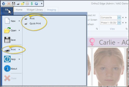Open the image layout you want to work with, then click Print from the File ribbon bar or your Quick Access toolbar. Or, press Ctrl+P on your keyboard. Then select the printing output options. If you specified the print orientation (portrait or landscape) for this type of layout in your Imaging Layouts editor, the layout will print in that orientation. Otherwise, Edge Imaging will choose the most appropriate orientation.