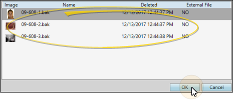 All the images that have been deleted from this patient's record are listed, along with the backup image name, the date the image was deleted, and whether the image was an external file. Select the image you want to restore, and click Ok.