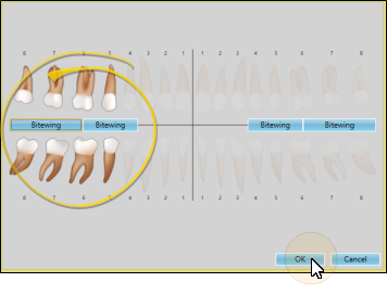 When you Single Import or Scan an image into an image type you have flagged as an X-Ray Location, you will be prompted to select the tooth or teeth to link to the image. You can use the Bitewing buttons on the tooth chart graphic to enable the most commonly included teeth, or click one or more teeth to link to the image. When you are finished, click Ok to continue importing the image into the patient folder.