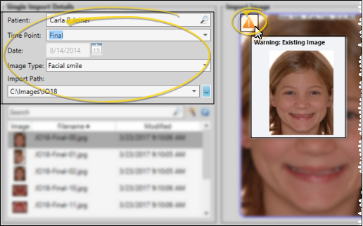 If an image already exists for an image type in this timepoint, you will see a Warning icon in the preview section of the window. You can hover over the icon to view the existing image. (X-Ray Location images do not show this warning: They do not overwrite any images, but simply add images to the Index layout of the patient's Imaging page, and optionally the patient's tooth chart.)