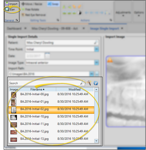 If you are using Single Import or Auto Import, choose the location of this patient's original images. You can click the dropdown button to select from a list of paths you've used on this workstation, or click [...] to browse to a different location if needed. You then see a list of the images found in that folder. You can ignore the Import Path and list of images when you are using Scan or Multi-Scan to add one or more image(s) to the patient folder.