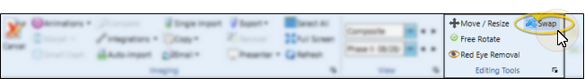 You can use the Swap tool to add external images to a patient folder, or to rearrange images in a layout. Swap is available from both image Editing mode and Single Import mode. You can enable Swap from the Editing section of the Imaging ribbon bar, or by holding down the ALT key on your keyboard.
