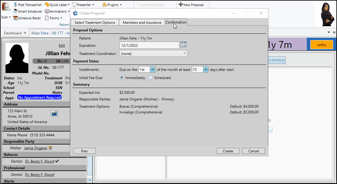 When you are happy with all of your proposal details, click Create at the bottom of the window to return to the Finance page of the patient folder. You can now make changes to the proposal details, if needed, just be sure to save your changes before exiting the patient folder.