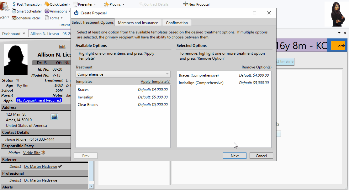 Once you have selected at least one treatment / template combination on the Select Treatment Options tab, you can either click Next at the bottom of the window, or select the Members and Insurance tab at the top of the window to choose who will be financially responsible for the contract.