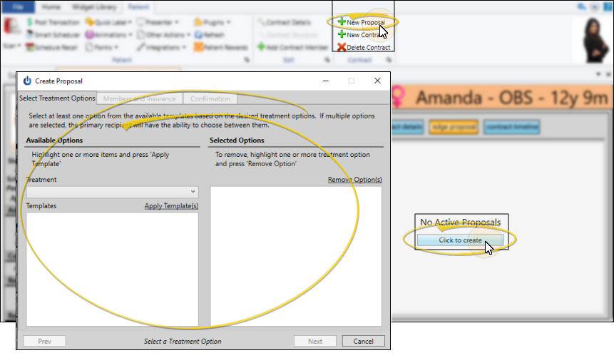 Open the Finance page of the patient folder. Select New Proposal from the Contract section of the Patient ribbon bar, or select Edge Proposal then Create Proposal from the Finance page window to launch the Create Proposal window. If needed, choose the Edge Proposal option.