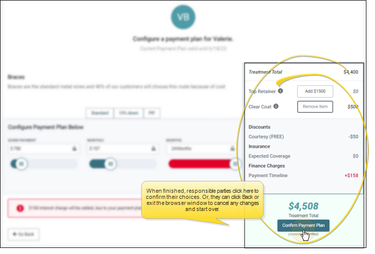 When the responsible party is satisfied with the treatments and financial structure, they select "Confirm Payment Plan", which places the contract in "Accepted" mode for single-party contracts, or "Waiting" mode for contracts requiring approval from additional responsible parties.