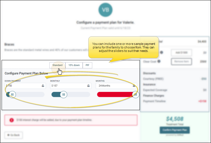 Financial Sliders - Responsible parties can use the financial sliders to adjust the amount of their down payment, monthly payment, and the number of payments. If a discount or finance charge "kicks in" as they make changes, that information appears below the sliders, as well as in the payment plan summary for their reference. Before you share the proposal with responsible parties, you can optionally choose to "lock" either the down payment amount or number of payments so the responsible party cannot change that value. The contract summary on the right side of the window updates automatically to reflect any changes.