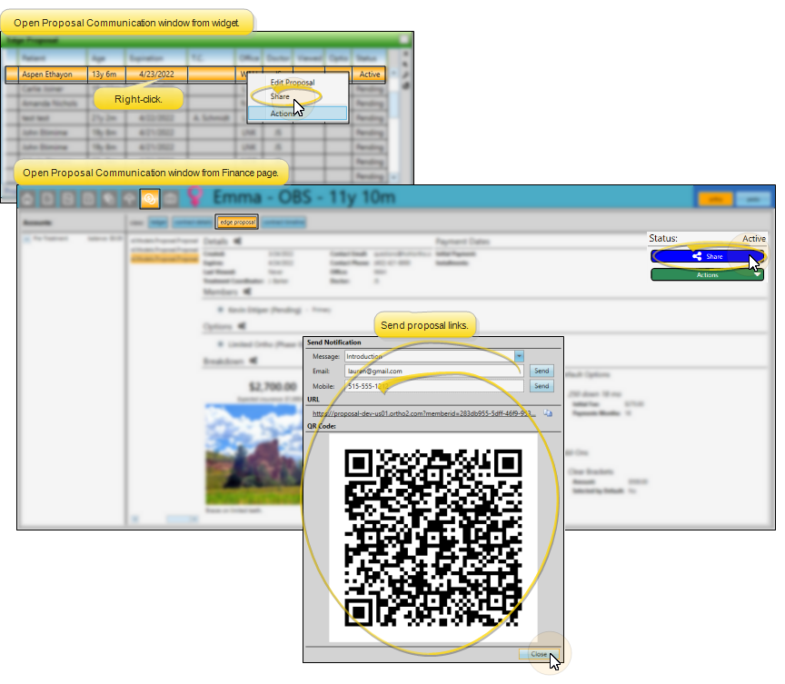 When you change a proposal status from "Pending" to "Active",the Proposal Communication window opens for you to share it with the responsible parties, inviting them to use the Edge Proposal app. If you need to share the proposal later, you can also open the Proposal Communication window by clicking Share from the Edge Proposal tab of the patient's Finance page, or by right-clicking the proposal in the Edge Proposal widget.