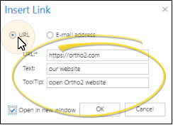 Enable the URL option, then enter the details. Be sure the website address for the link includes "http://" or "https://"