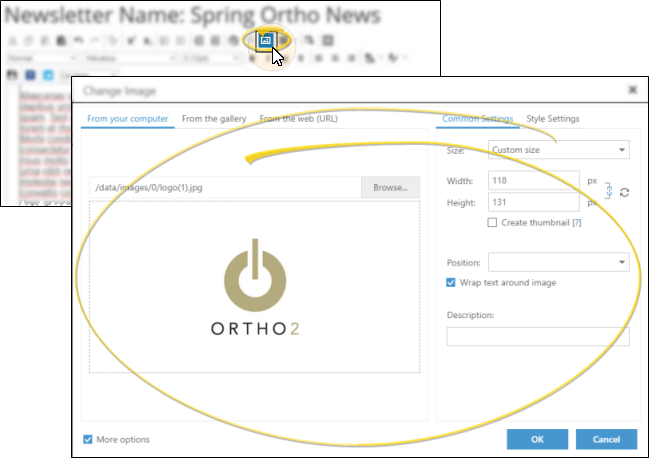 From Your Computer – Select this tab, then browse to the image file on your computer. Or, drag an image from your computer onto the Insert Image window. Once you use the image in a newsletter, it will be copied to the Image Gallery for future use.