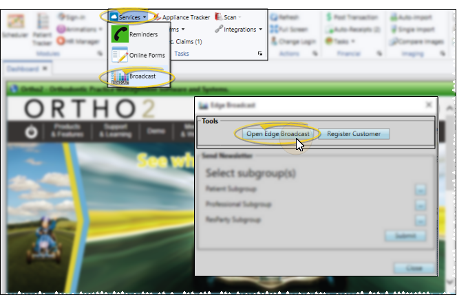 Select Services from the Tasks section of the Home ribbon bar and choose Broadcast. Then choose the Open Edge Broadcast option from the Tools section of the window. Or, navigate to https://edgebroadcast.ortho2.com. The Edge Broadcast application main window will open in your default browser.