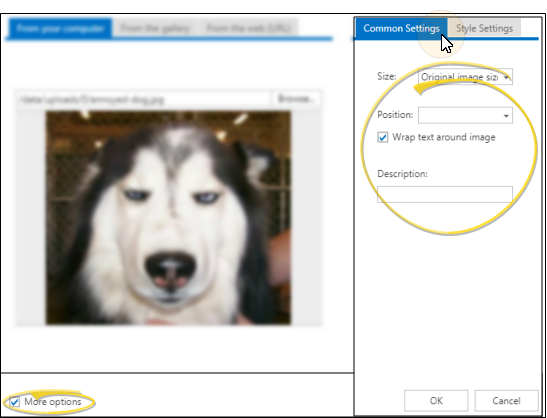 Enable the More Options checkbox at the bottom of the window, then use the Common Settings tab to set the size, text features, and description.