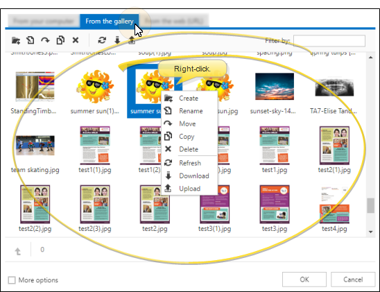 From the Gallery – Select this tab, then click to choose the image you want to use. Any image you have already used is stored in the gallery (with the exception of URL images that are inserted with the Save File to Server option disabled). To manage the images in the gallery, you can use the toolbar at the top of the window, or right-click an image to create folders within the gallery, and rename, move, copy, delete, and download the images. You can also upload images to the gallery that you have not yet used, so that they are easily accessed later.