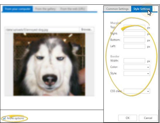 Enable the More Options checkbox at the bottom of the window, then use the Style Settings tab to set the margins, border, and image style.