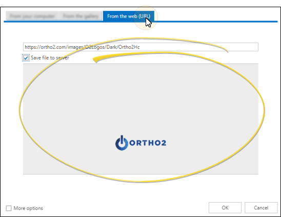 From the Web (URL) – To use an image from the Internet, right-click the image on the web page and select Copy Link Address. Then, select this tab, and paste the copied URL into the space provided. To save the image in the gallery for future use, enable the Save File to Server option.
