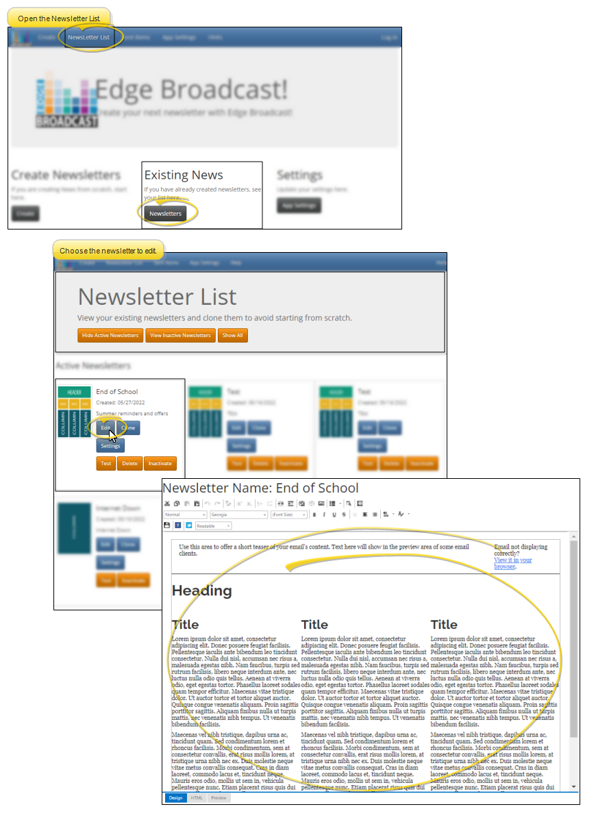This article talks about creating and editing the content of your newsletter, that is, the text, images, hyperlinks, and social media posts. To work with the newsletter name, email subject and description, open the Newsletter Settings window instead. See "Edge Broadcast Newsletter Settings" for details.