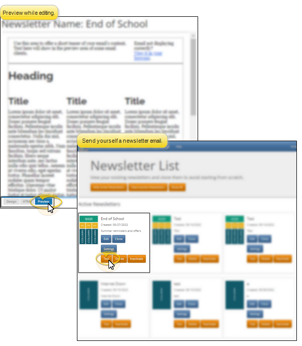 Click the Preview tab at the bottom of window while editing your newsletter to see what it will look like in a reader's Internet browser, and to test your hyperlinks. You can click Test from the Newsletter List window, then enter an email address (such as your own address) to see what the newsletter email message will look like when someone receives it. See "Manage Edge Broadcast Newsletters" for details.