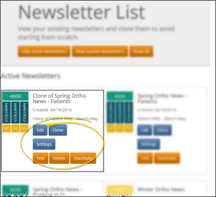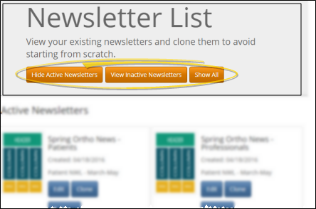 You can inactivate newsletters you no longer need to use or see on a regular basis. You can use the Hide / Show Inactive Newsletters or Show All button at the top of the Newsletter List window to include inactive newsletters in the list. While viewing inactive newsletters, you can click Reactivate to include a newsletter in the active newsletter list again.
