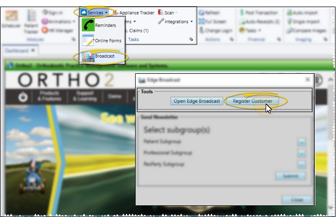 Select  Services from the Tasks section of the Home ribbon bar and choose  Broadcast. Then select the Register Customer option from the Tools section of the window. (An active Internet connection is required for this feature to work.)