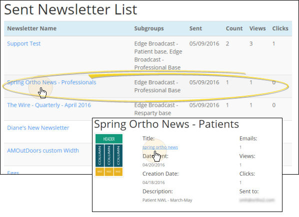 You can click a newsletter name to open further details about that item, including the date the newsletter was sent, and the email addresses that it was sent to. In addition, you can click the name in the newsletter detail window to open a copy of the newsletter for your review.