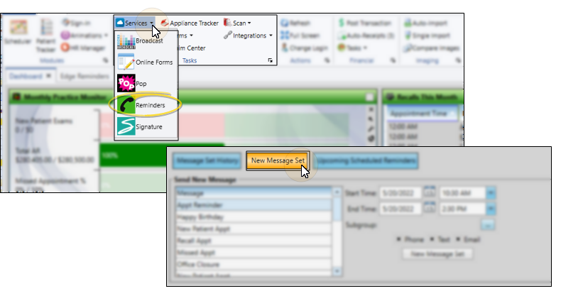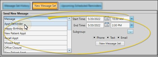 Use the New Message Set tab of your Edge Reminders window to manually initiate appointment reminders, birthday greetings, and other messages to subgroups of patients via phone, email, and/or text.