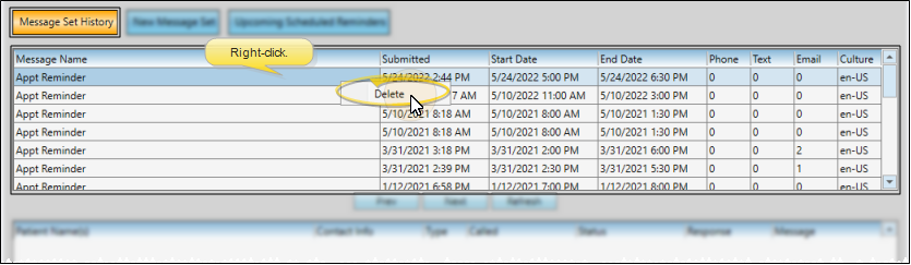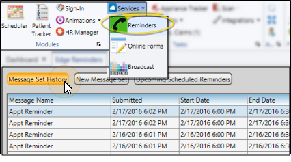Use the Message Set History tab of your Edge Reminders window, or open the Reminders widget, to review the success rate of your message deliveries, the confirmed / canceled appointment responses you have received, and to listen to voice messages patients may have left regarding their appointment reminder. We recommend that you open the Edge Reminders window or widget early in your day to listen to any patient messages, and review any appointment confirmations and cancellations you have received overnight. See "Review Sent Messages" for details.