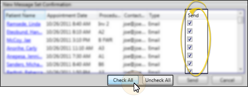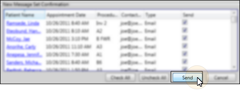 When you are happy with the message type, details, and patients to notify, click Send at the bottom of the window. The messages will then be delivered within the date/time settings you selected.