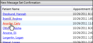 A few moments after clicking New Message Set, you will see a list of the patients that will be contacted with your selected message. You can click a name to open that patient folder, and de-select patients to exclude them from receiving the message.