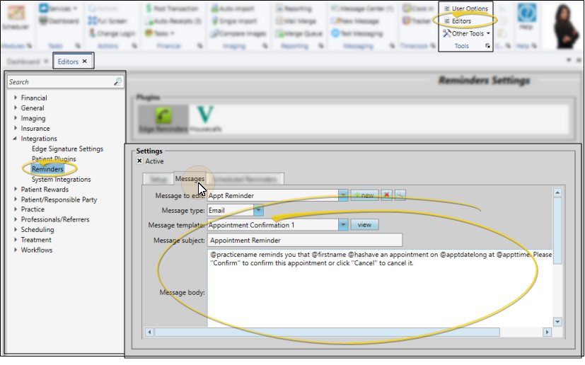 Use the Messages tab of your Reminders editor to create and edit the Edge Reminders messages you send via email and text message. (To create and update telephone voice messages, contact Ortho2.) See "Set Up Edge Reminders Messages" for details.