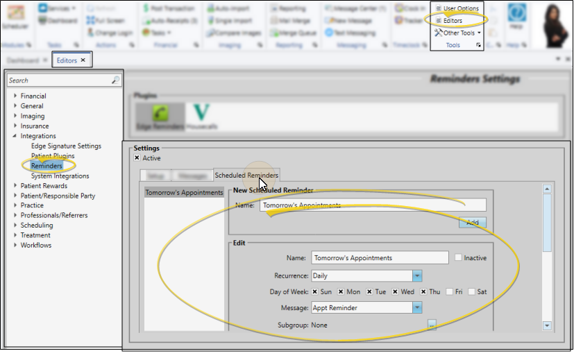Use the Scheduled Reminders tab of your Reminders editor to schedule recurring messages, such as daily appointment reminders, and weekly birthday reminders. See "Set Up Scheduled Reminders" for details.