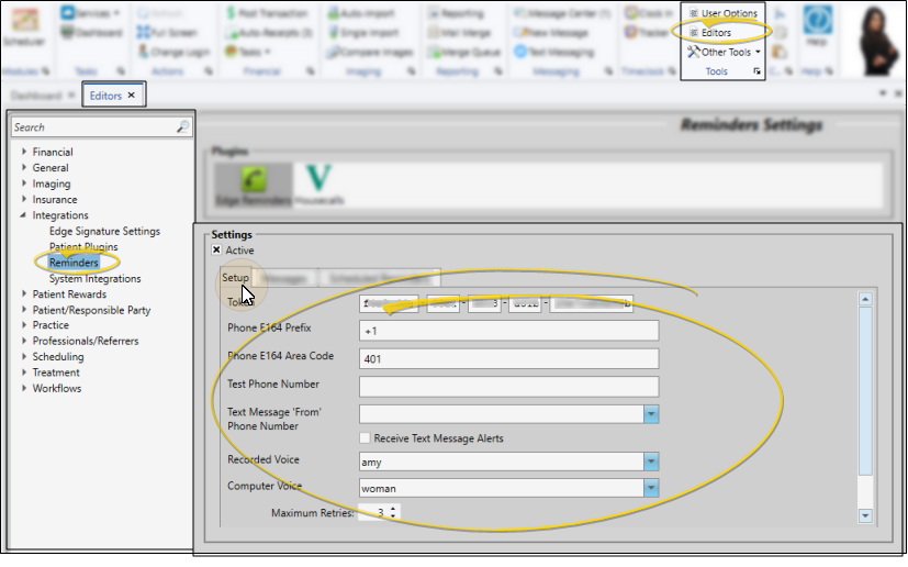 Use the Setup tab of the Reminders editor to activate your Edge Reminders integration, select your texting phone number, choose the telephone voice, and set up how many times to retry failed messages. See "Set Up the Edge Reminders Integration" for details.