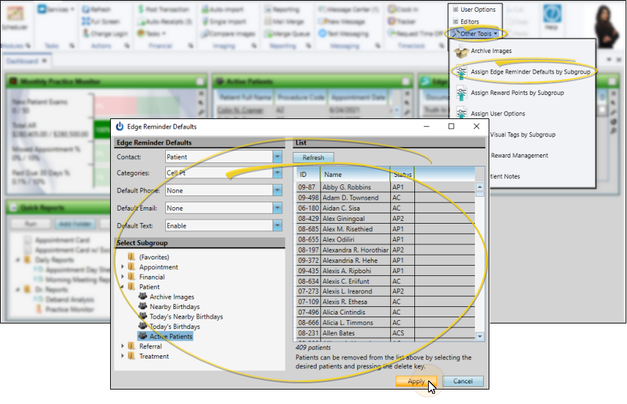 You can enable / disable Edge Reminders contact flags for any subgroup of patients with the Assign Edge Reminders Defaults tool. You might use this, for example, to enable the Text Message flag for the Patient Cell contact type of all "Active" patients when you first start sending appointment reminder text messages. See " Apply Edge Reminders Contact Flags to a Subgroup" for details.