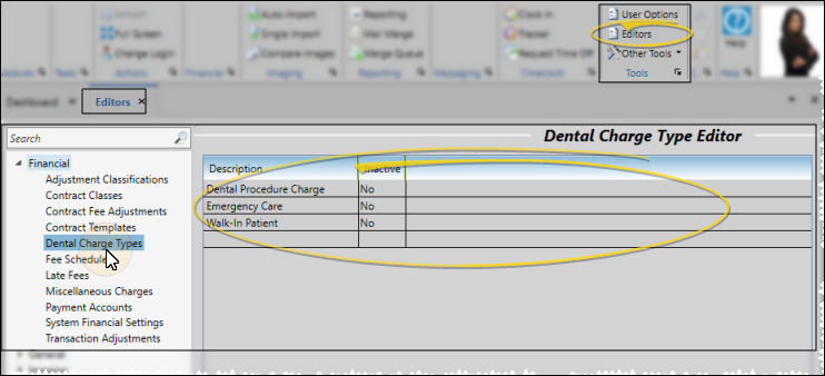 Open Dental Charge Types Editor - Select Editors from the Tools section of the Home ribbon bar. Then, from the Financial section, open the Dental Charge Types editor. (You can also use the Search field to look for the editor you want to work with.)