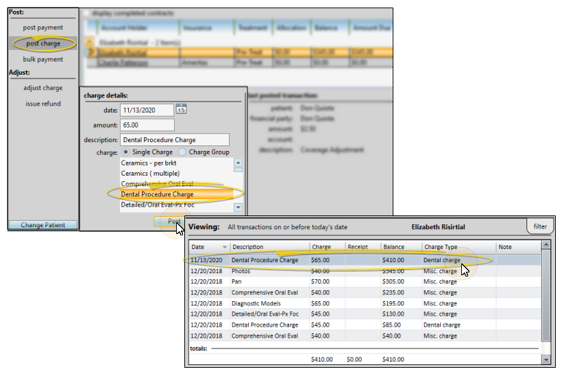 When you post a charge for a patient, your dental charge types appear within the list of miscellaneous charges. Once posted, the charge is flagged as a Dental Charge, rather than a Misc. Charge in the patient ledger.