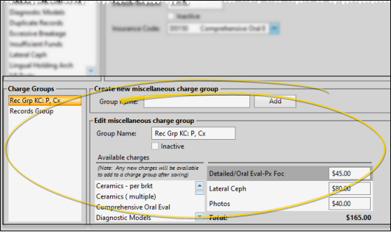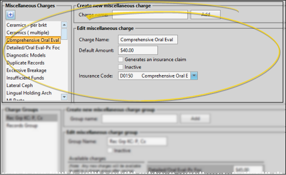 Use the Miscellaneous Charge editor to create and maintain your list of non-contract charges. Each charge includes a description, insurance code, and default amount. You can also create groups of charges that should be posted together, and choose to auto-generate electronic insurance claims whenever specific miscellaneous charges are posted.