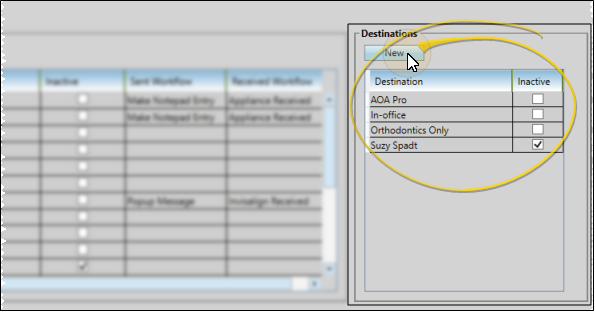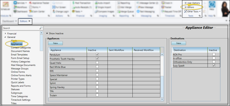 Use the Appliance editor to list the types of patient appliances you prescribe, and to define the destinations, or facilities you use for laboratory and other appliance services. If you have your own appliance lab, we suggest you include your office as a destination.
