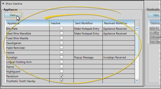 Assign Workflows - (Optional.) Select an appliance to work with, then click in the Send Workflow or Received Workflow column to assign a workflow to be triggered when the selected appliance is either flagged as "sent" or "received" in a patient folder. (See "Workflow Editor" for details about creating workflows.)