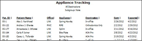 Run the Appliance Tracking report to review the patient appliances you have sent for service, but that are not yet returned. The report uses data you have entered into the Appliance Tracking feature, including the appliance destination and the date you expect the service to be completed. You can specify which destination to include on the report, or choose to see all non-returned appliances. See "Appliance Tracking Report" for details.