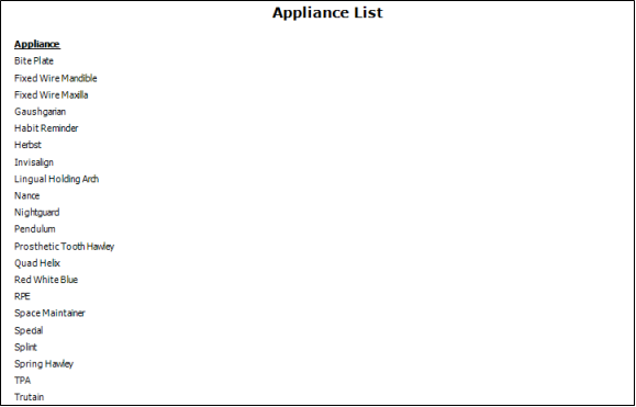 Run the Appliance List report to obtain a list of patient appliances you track in your Edge Cloud patient folders. Both active and inactive records are included in the report. See "Appliance List" for details.