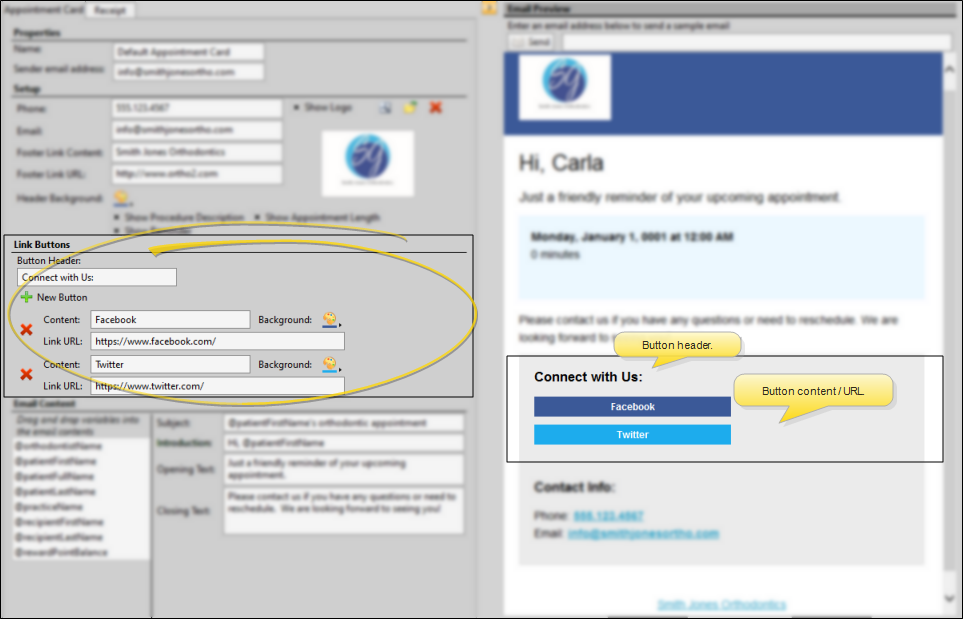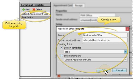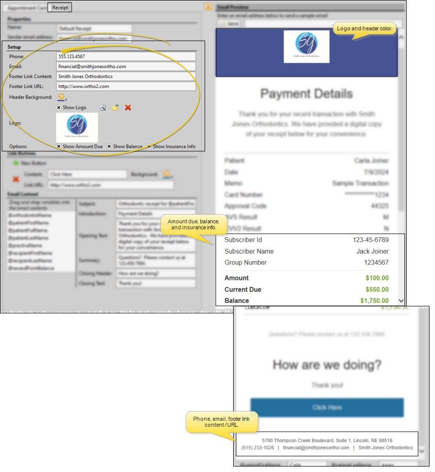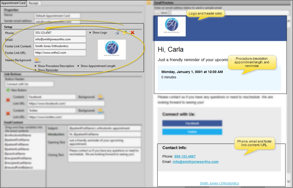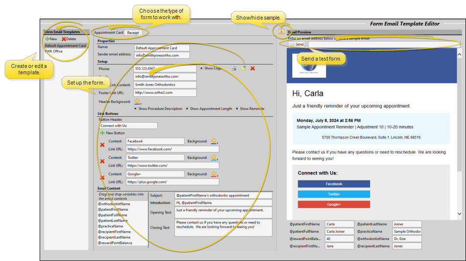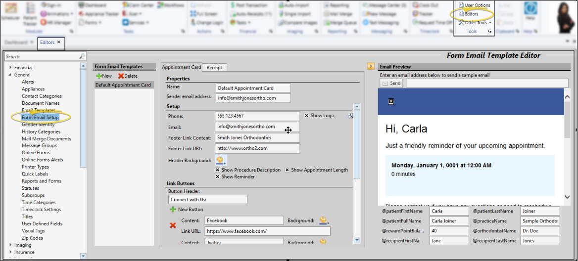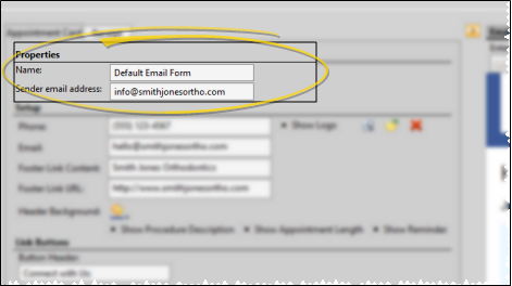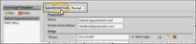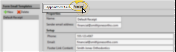 Use the Form Email Setup editor to create and manage appointment cards and payment receipts that you email to your patients and responsible parties.